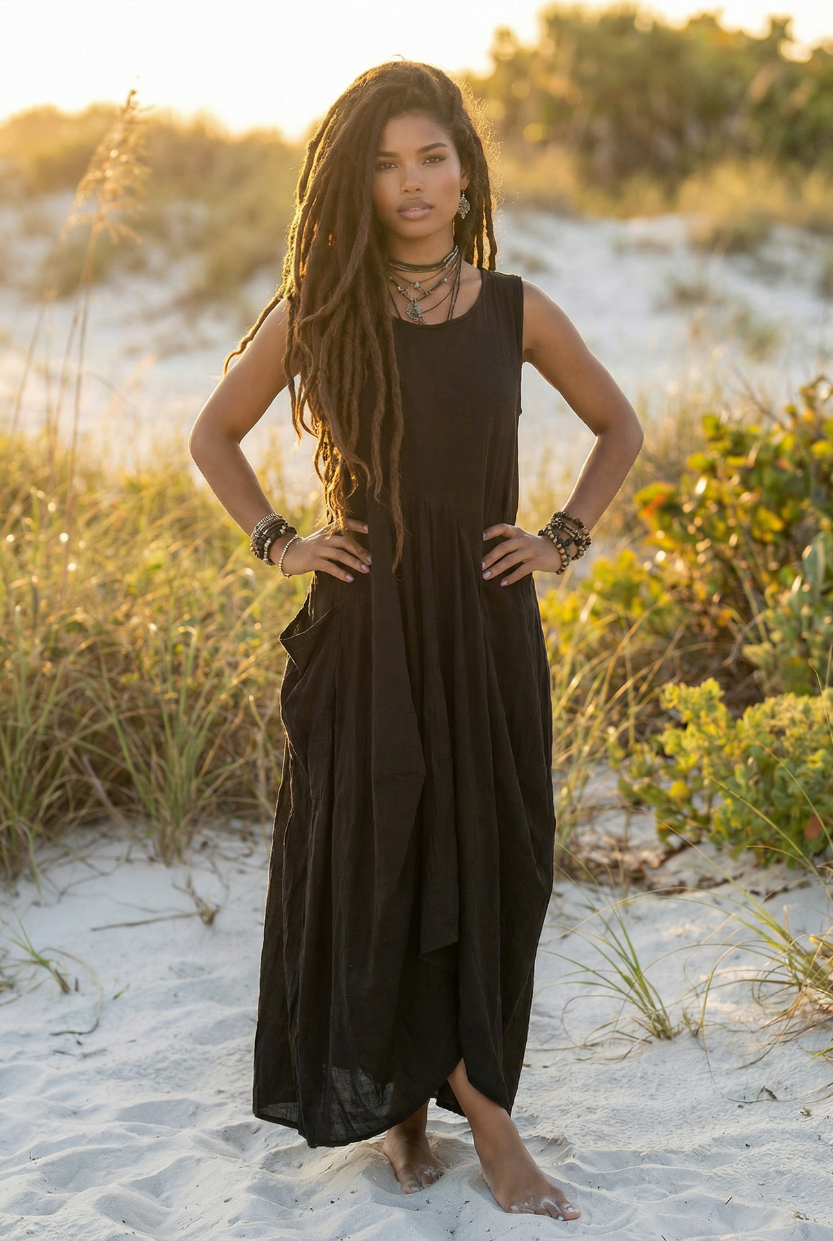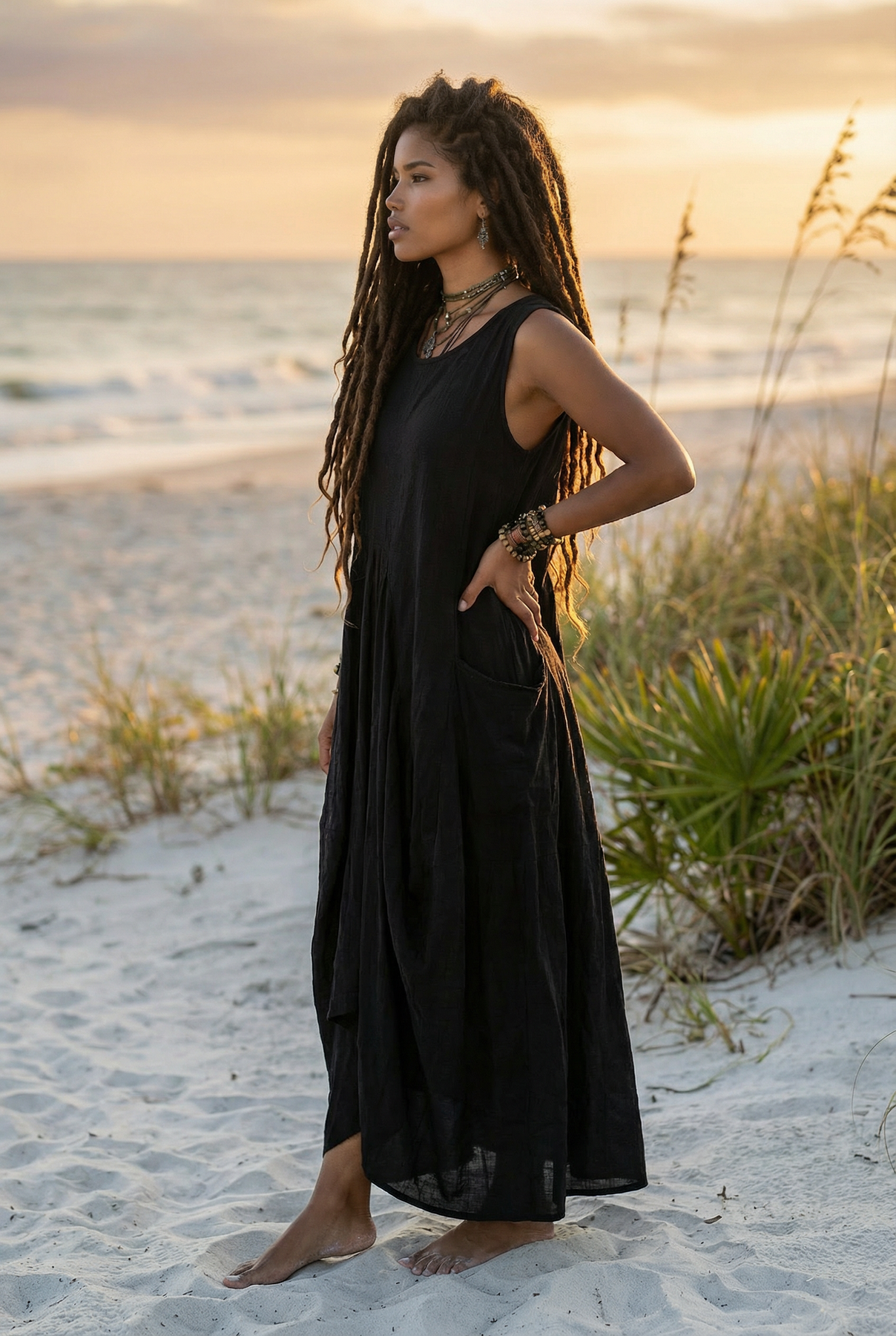 Woman in a black dress standing on a sandy beach with grass and sand dunes in the background.
