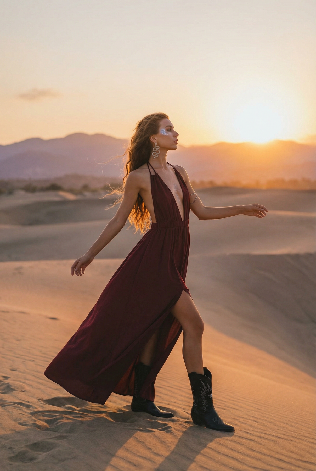 Woman in a burgundy dress with a high slit standing on a beach.