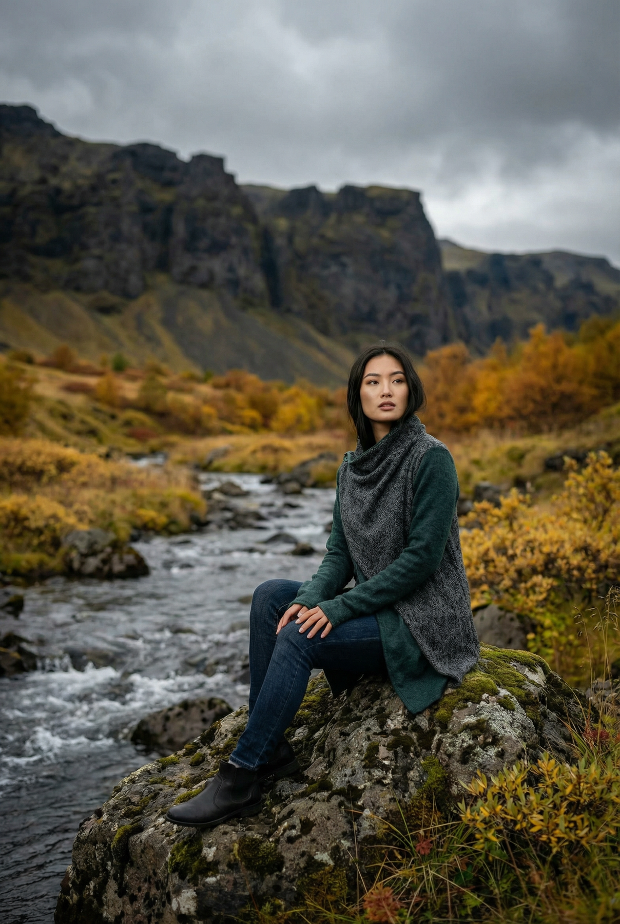 Woman wearing a green and gray coat standing in a field with mountains in the background