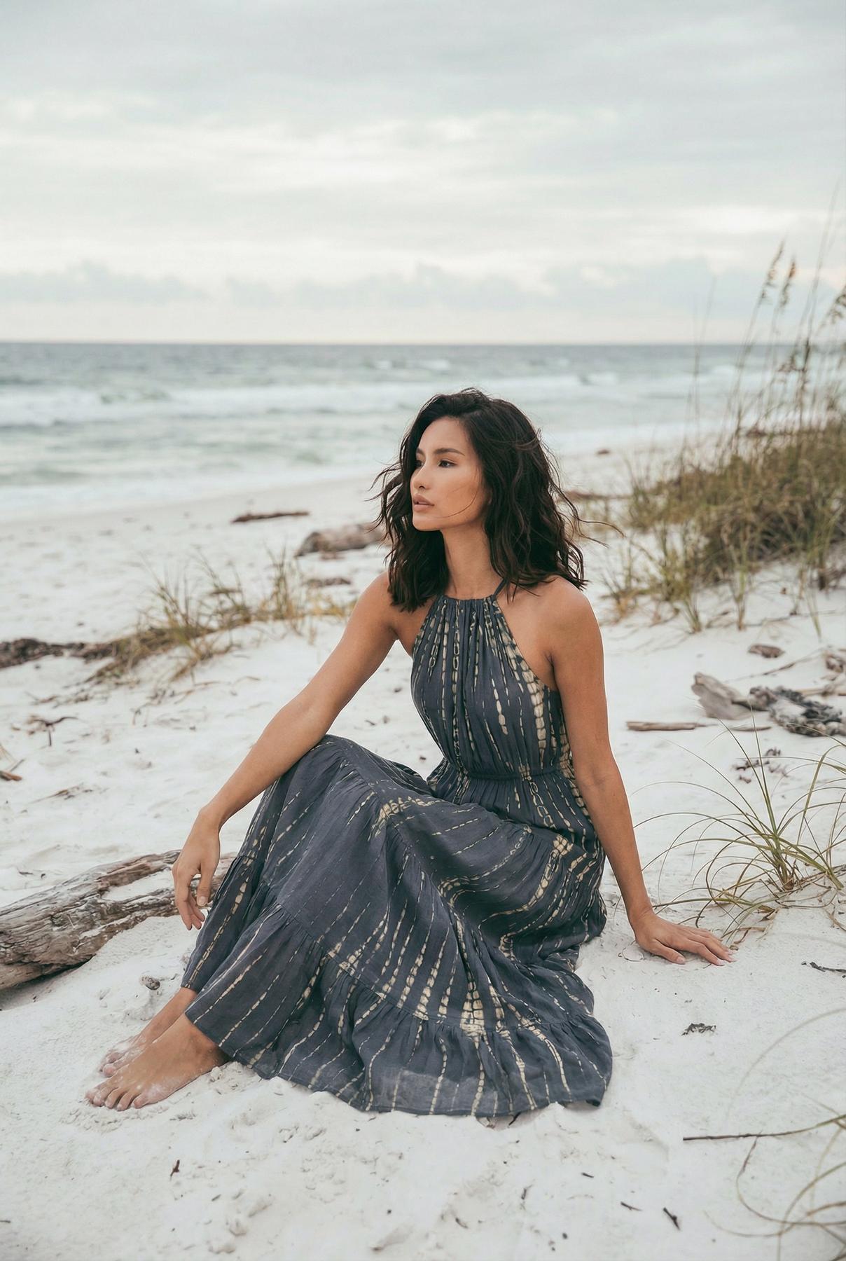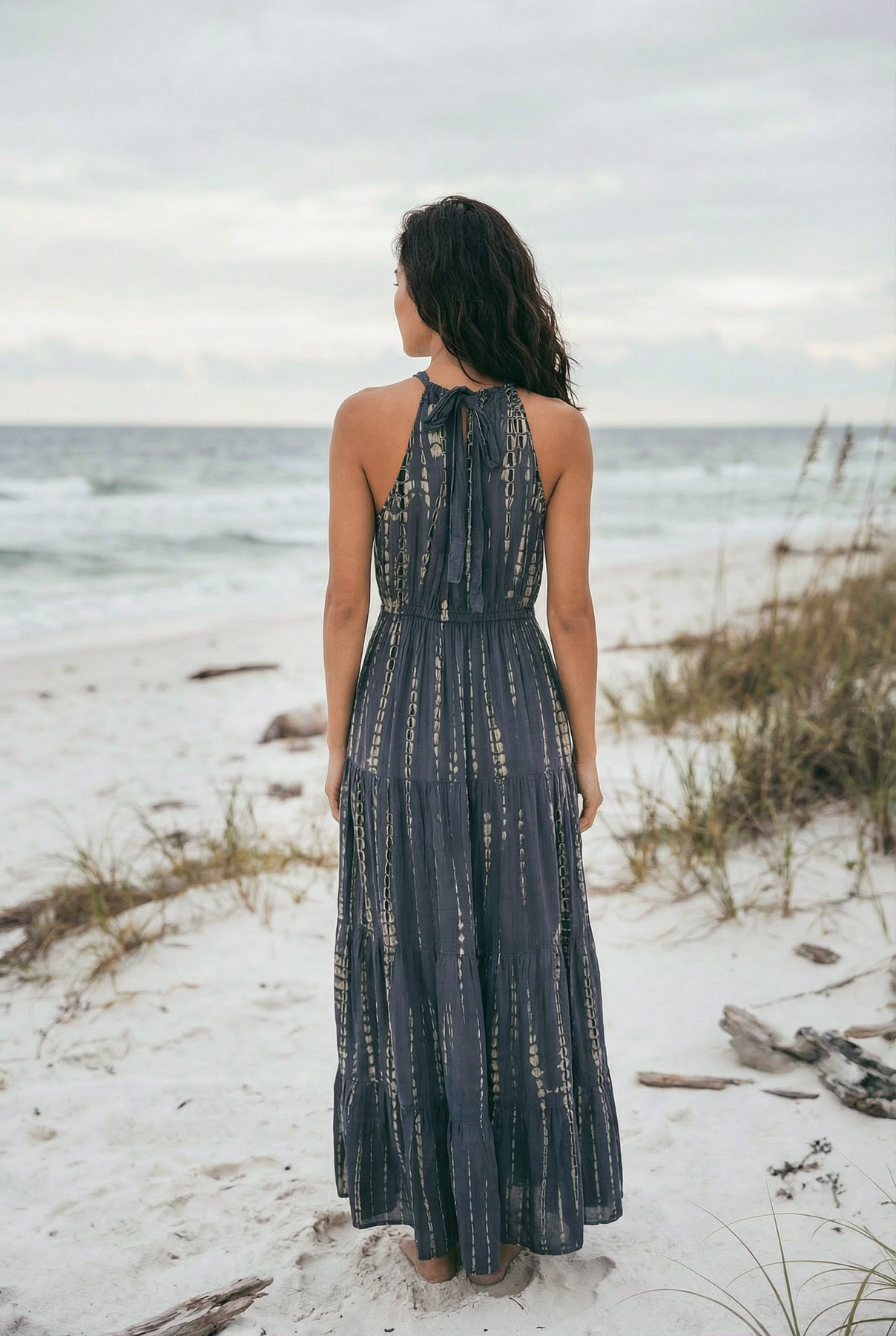 Woman in a long dress standing on a beach with ocean and sky in the background