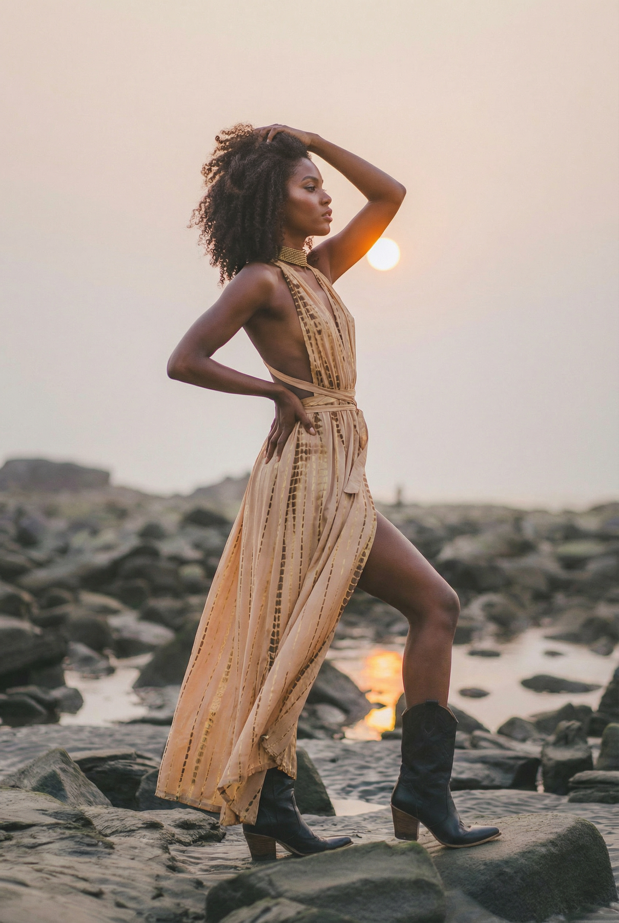 Woman in a long beige dress standing on a rocky beach with sunset in the background